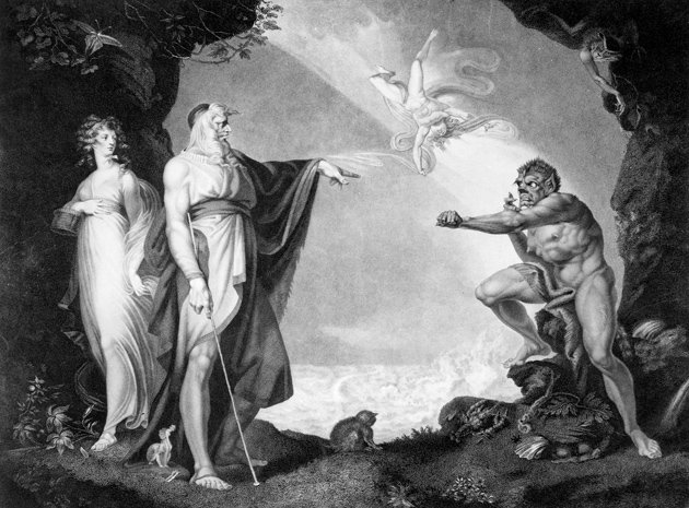 One day Prospero realizes his unbeloved enemies are sailing by, conjures a storm to smash their ship ashore, then proceeeds to torture them with the help of the spirit Ariel (whom he’s enslaved) and the savage Caliban (whom he’s enslaved). (Prospero ain’t no saint!)